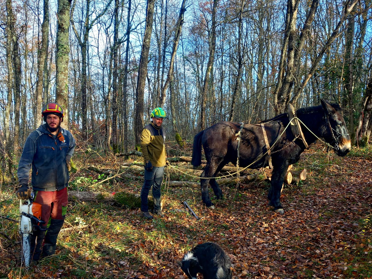 Merci aux bûcherons Sylvain et Mario et à Cédric le muletier pour leur accueil et leur présentation de ce chantier. Et Merci à Urzout, le mulet !